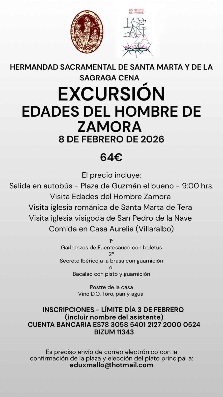 Inscripciones hasta el 3 de febrero mediante transferencia o bizum a los números de cuenta de la Hermandad, es preciso recalcar el nombre del asistente y confirmarlo enviando un correo electrónico a